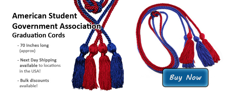American Student Government Association graduation cords (a royal blue and red double tied cord) are a great way to recognize student leaders at their commencement exercises. The ASGA is a professional association for students in Student Government at the colleges and universities in all 50 states. The American Student Government Association serves and supports the Student Governments at all of the institutions of higher learning where they are present. Wearing ASGA graduation cords shows appreciation to those who serve other students, and recognize dedication in leadership positions.