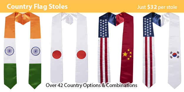 If you are looking for a country combination not listed, let us know! We can manufacture stoles with most country's flag or flag combination with a minimum order of 10 pieces and 6-8 weeks manufacturing time.